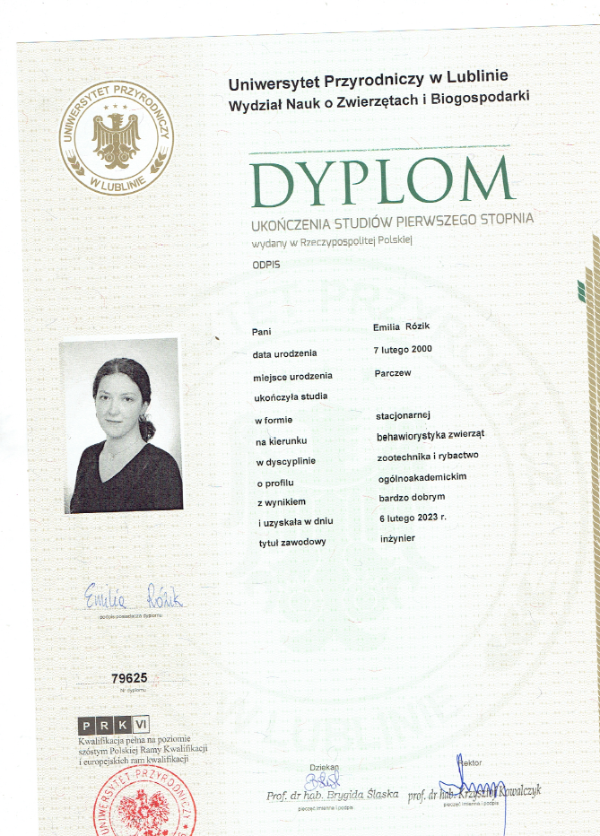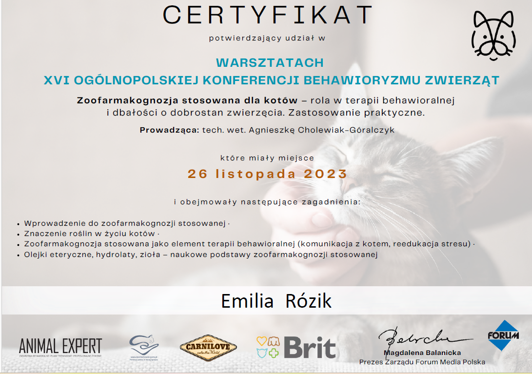 W 2024 r. ukończyłam kurs farmakoterapii behawioralnej psów i kotów.